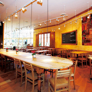 ベルギーの田舎家をイメージした店内の内装は世界共通。廃材や再生木材を使用し、専門のデザイナーがデザインしています。塗り壁もフランスから左官職人を呼んで技術を伝授し、日本の職人さんがそれをもとにして、温もりのある壁に仕上げてあります。心の故郷の様に寛いだ心地でお過ごしいただける癒しの空間です。
